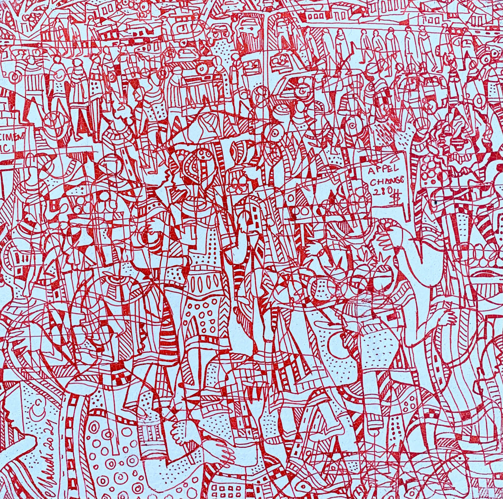 La ligne exprime la vie dans son dynamisme, elle semble infinie et remplit la toile dans une sorte d’Horror Vacui qui peut aussi bien évoquer la réalité d’une ville encombrée comme Kinshasa, que l’absence de vide dans l’univers. La palette colorée limitée utilisée par l’artiste accentue la qualité graphique de son travail. De loin, ses œuvres évoquent des monochromes flous, avant de révéler des paysages urbains vibrants. « Dans la symbiotique l'erreur n'existe pas, si on sait l'exploiter, elle devient une nouvelle ligne, que l'on intègre dans la composition. »