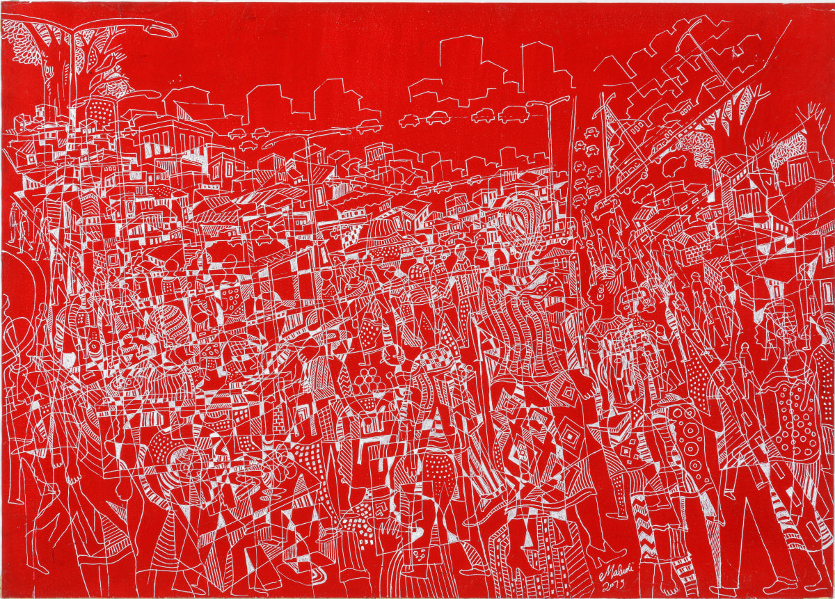 Houston Maludi dessine depuis tout petit et réalise ses premiers dessins avec de l’aquarelle qu’il récupère chez un de ses oncles et un bout de bois en guise de pinceau. Il a étudié à l’Académie des Beaux-arts de Kinshasa dont il sort diplômé de la section peinture en 1997. Inspiré par les peintres cubistes Georges Braques et Pablo Picasso et après des années d’expérimentations et de recherches esthétiques, il développe en 2008 un cubisme personnel, le « Monochromique Cubisme Symbiotique Quantique » qu’il obtient par une « symbiose des formes. » Houston Maludi utilise principalement le noir et blanc (ou d’autres bichromies tranchées) et une ligne continue sinueuse qui définit tous les niveaux de lecture de l’oeuvre. Il cherche à atteindre « une unité parfaite et discrète des éléments ». La même courbe peut tracer l’épaule d’un personnage au premier plan et le rebord d’une route bondée à un autre niveau de lecture. Tout est dans tout.